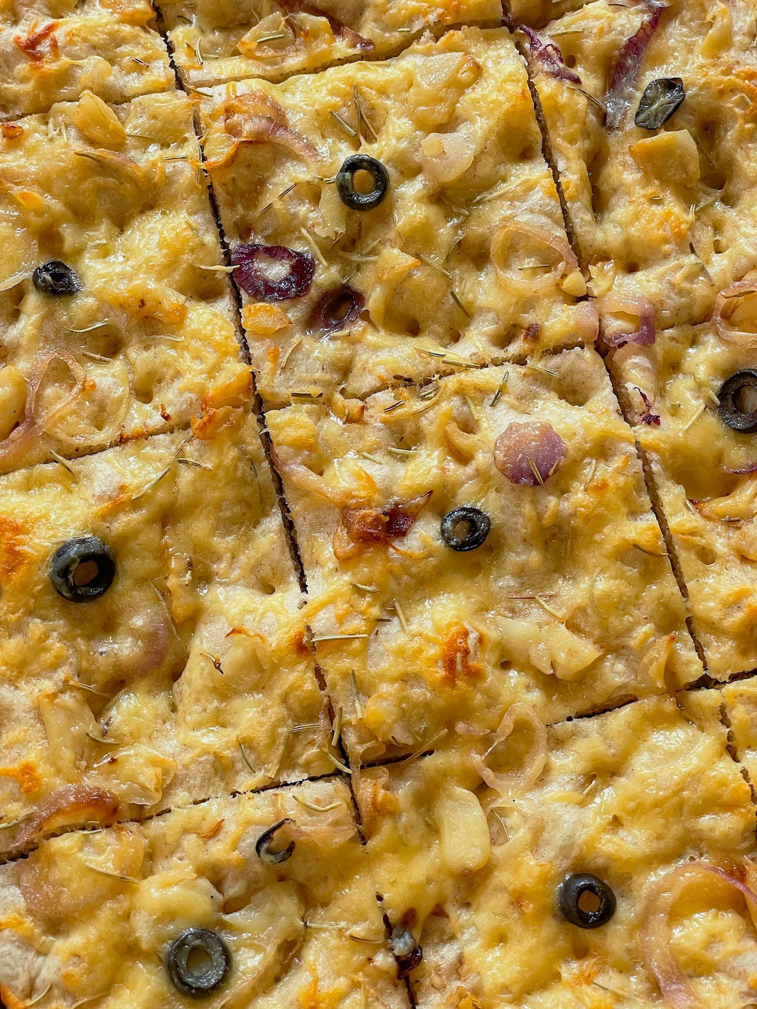 Our Focaccia is soft, airy, and topped with olive oil, herbs, and onions.